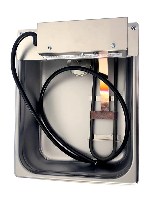 500W/120V 1/2 Size X 4″ Deep Condensate Evap Pan. This evap pan features stainless steel material throughout. The float is made of electro polished 316 Stainless Steel and the rest of the components are made of 301/304 Stainless Steel. Standard features include a 14-3 gauge wire with pigtail end for easy connection to existing power, a safety sensor to protect the heating element from over heating. Comes with your choice of either flat or bent legs with screw down holes to securely attach to the case. This pan has an estimated liquid capacity of 6.7 quarts and an estimated dissipation rate of 17 quarts per day. Pan Dimensions are 10 3/8″ x 12 3/4″ x 4″. With the Control Box on top, it measures 6 3/4″ high. Optional equipment includes: